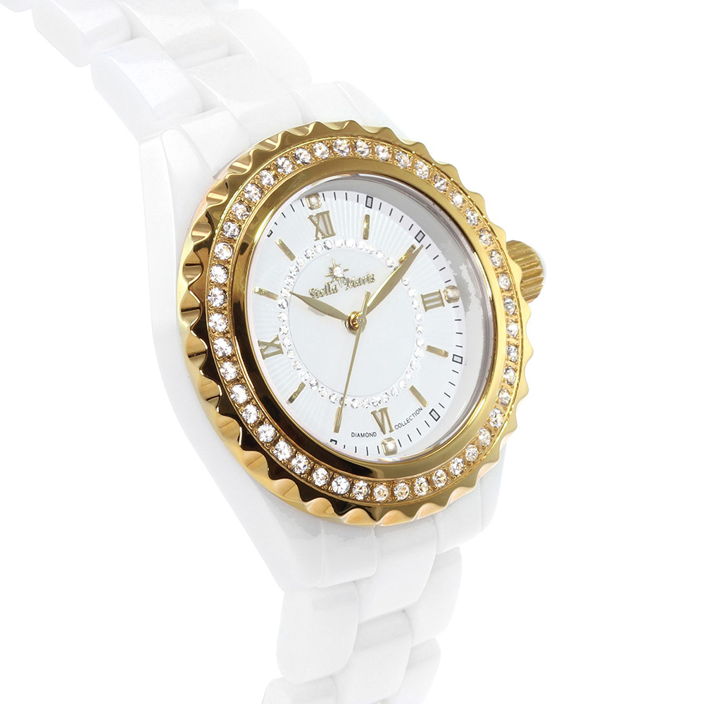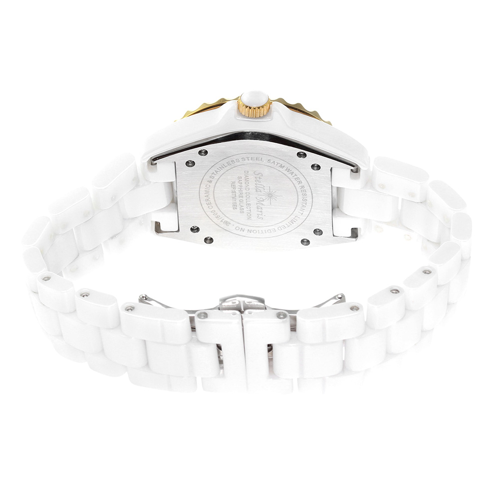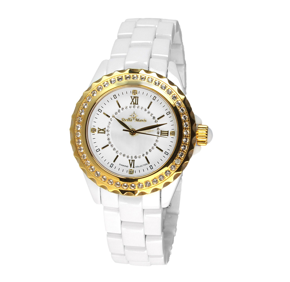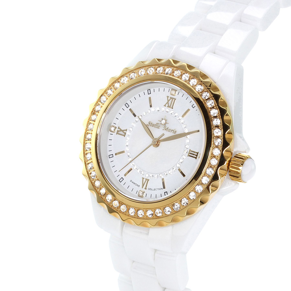 Noble brilliance, like a mystic star with an exclusive watch of Stella Maris. Especially refined and processed high quality ceramic material and five fine diamonds on the dial make this watch an eye-catcher on every wrist. The stainless steel bezel is decorated with 45 Swarovski elements that are to naked eye, indistinguishable in brilliance compared to their role models, the diamonds. Genuine sapphire crystal is used alongside with rhodium plated stainless steel in order to protec this watch and maintain its long-term brilliance. The particularly sophisticated dial inlaid with genuine mother of pearl, which is embedded with 40 Swarovski elements. Experience the luxury and an indispensable accessory.